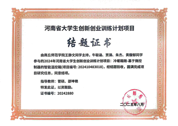 近日,国家级大学生创新创业训练计划项目圆满完成各项预设任务,顺利通过结题验收。该项目由教育部主导实施,是深化高校创新创业教育改革的核心载体,秉持“兴趣驱动、自主实践、重在过程”的核心原则,已连续多年成为高校人才培养质量评估的重要参考。在学院领导的前瞻引领与创新实践平台、专项经费等资源的全方位赋能下,项目团队在导师指导下,跨学科协作攻关,系统开展调研论证、方案设计与实践验证,最终以扎实的研究成果达成结项标准。