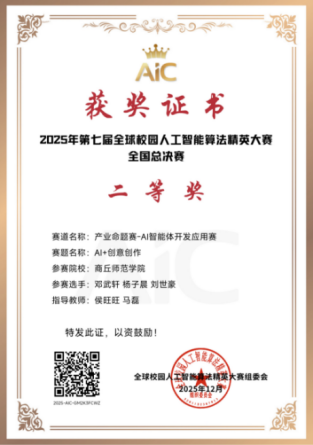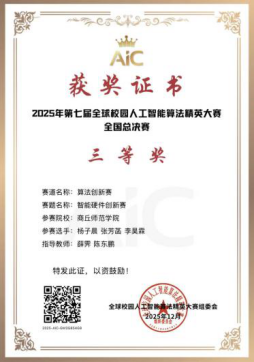 2025年12月,第七届国际青年人工智能大赛总决赛圆满收官,国家级获奖名单正式对外公布。该赛事由中国人工智能学会主办、联合国可持续发展目标全球协作项目工作委员会支持,是全球竞赛水平高、参与院校广的国际级青年人工智能高端赛事。在学院领导的悉心领导、跨学科导师团队等资源的精准赋能下,我院参赛最终斩获国家级三等奖2项。