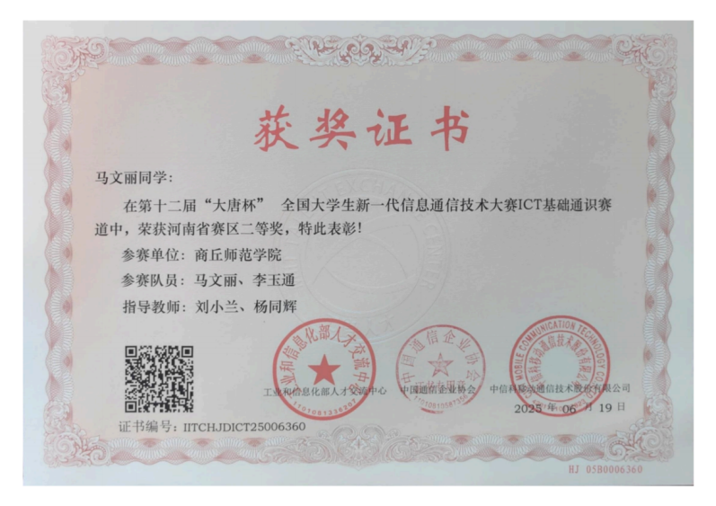 一、国际教育学院(归德书院)师生在第十二届“大唐杯”全国大学生新一代信息通信技术大赛中荣获省级二等奖
