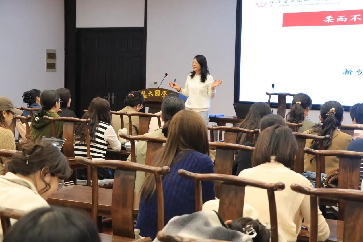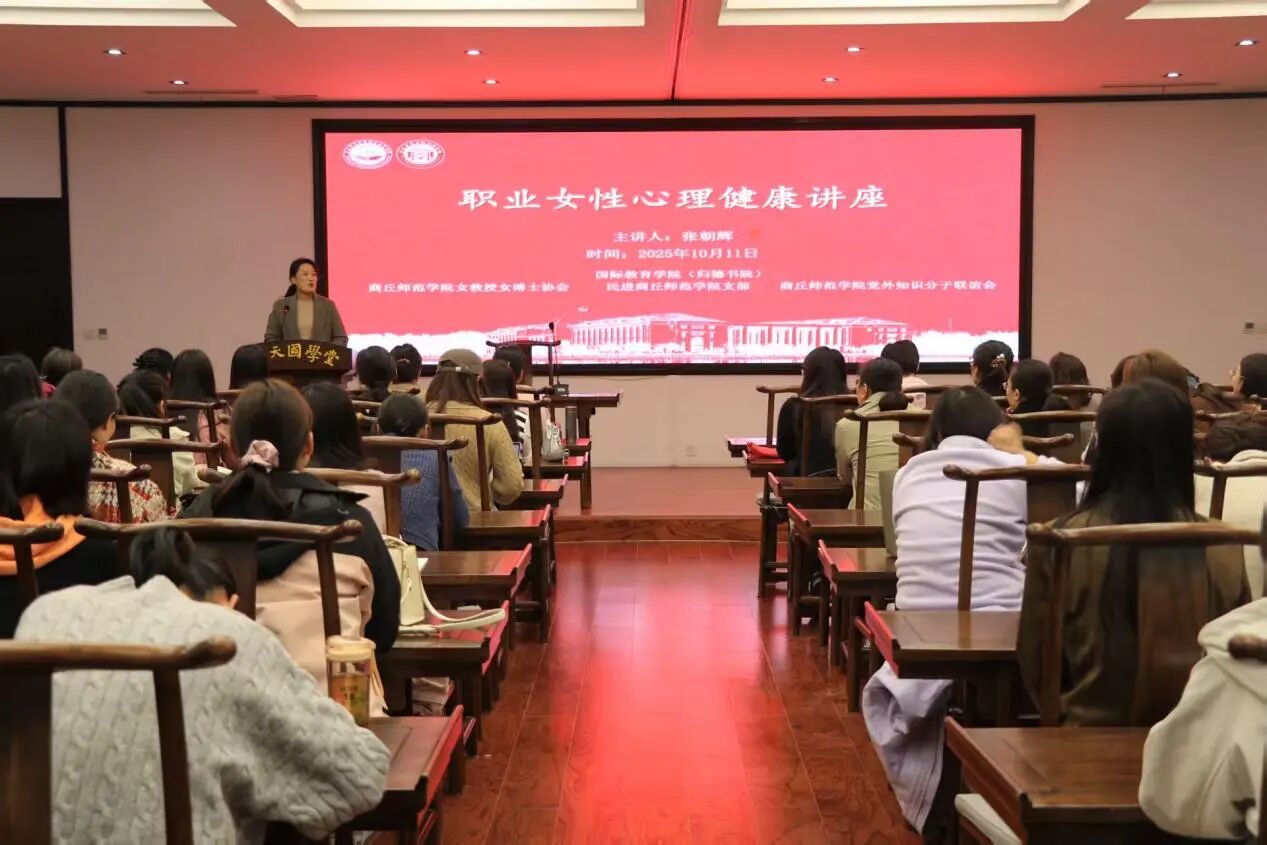 为深入关切我校女性教职工心理健康需求,助力其有效疏解职场压力、构建工作与生活的动态平衡,以更积极饱满的状态投身教育教学与个人发展,时值第34个世界精神卫生日之际,10月11日,国际教育学院(归德书院)“归德大讲堂” 特邀资深心理专家张朝辉教授,在汉梁楼应天国学堂开展 “柔而不弱,坚而不强——职业女性心理健康” 主题讲座。本次讲座由国际教育学院(归德书院)联合商丘师范学院女教授女博士协会、民进商丘师范学院支部、商丘师范学院党外知识分子联谊会共同主办,我校女性教职工代表参会,国际教育学院(归德书院)副院长杨静主持。