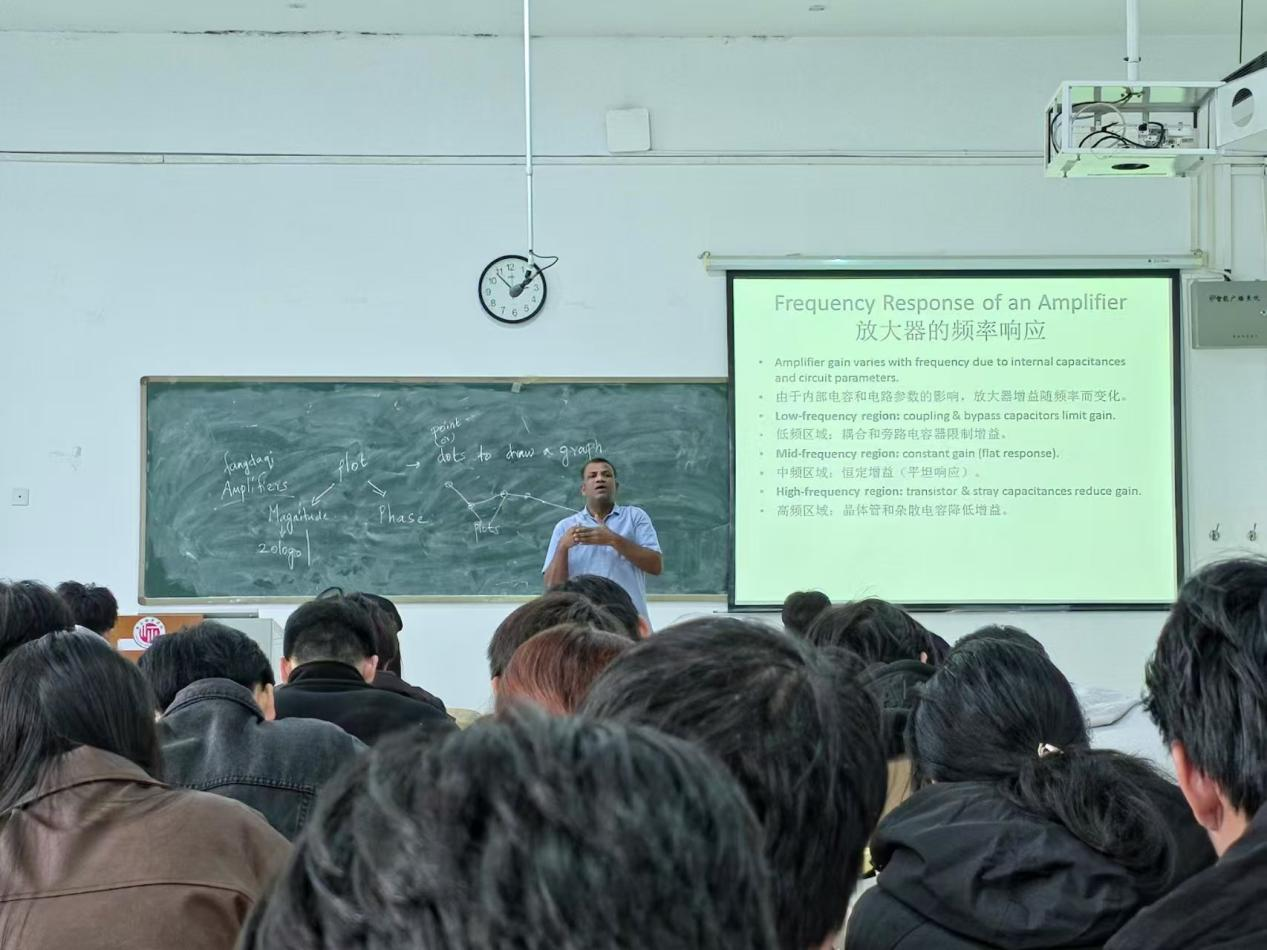 根据中外合作办学要求,国际教育学院于2025年9月为2024级通信工程专业学生引进Analog Electronic Technology A(《模拟电子技术A》)。此次授课的是计算机应用专业的Manimaran教师。