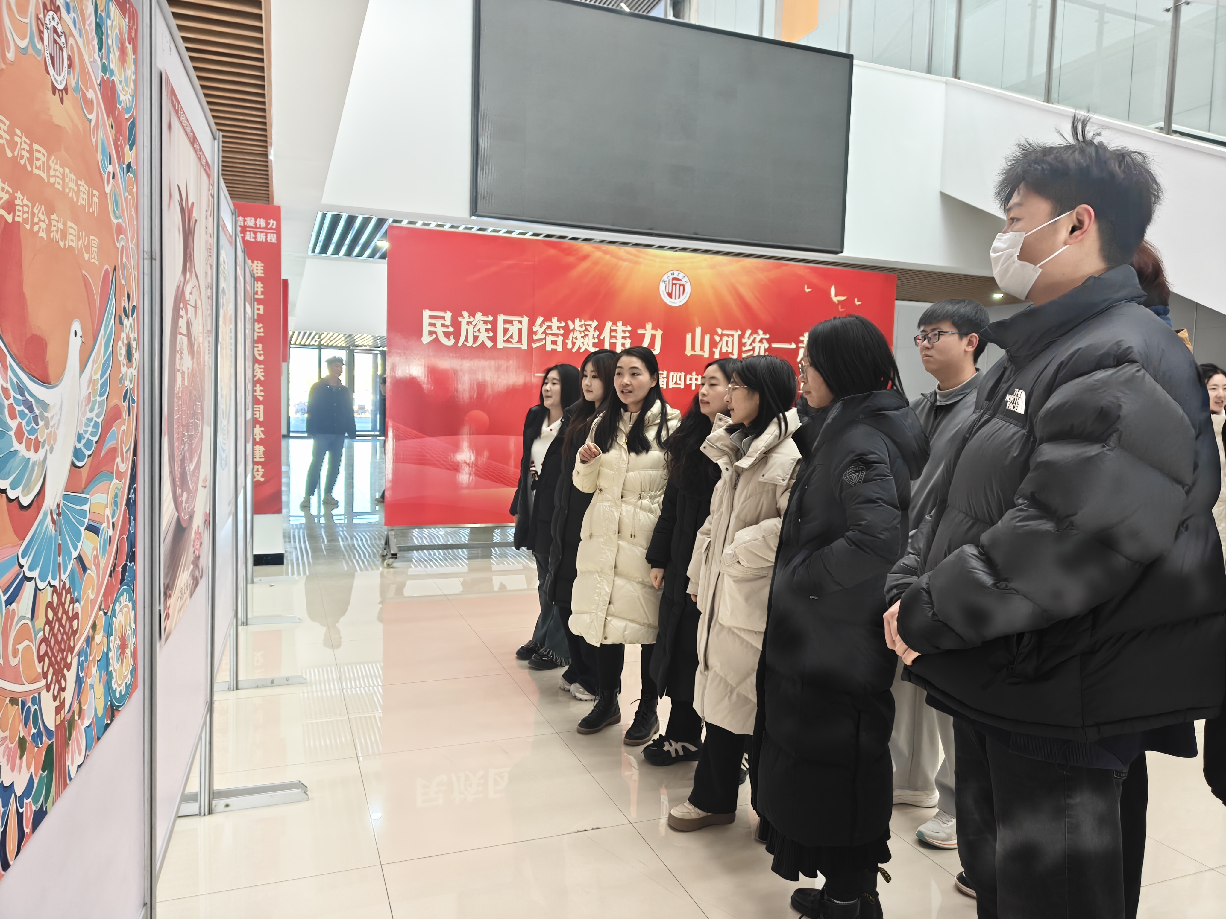 主题展环节是本次活动的亮点内容。全体学生党员有序驻足观看了“民族团结凝伟力 山河统一赴新程——党的二十届四中全会精神学习宣传主题展”。此次展览通过图片展示、案例呈现等丰富形式,系统呈现党的二十届四中全会精神精髓,生动再现各民族交往交流交融的鲜活场景,清晰梳理祖国统一大业的发展脉络。党员们驻足观展、认真研读,不时相互交流感悟,在沉浸式学习中深化了对全会精神的理解,进一步增强了对中华民族共同体的认同感和对祖国完全统一的坚定信念。